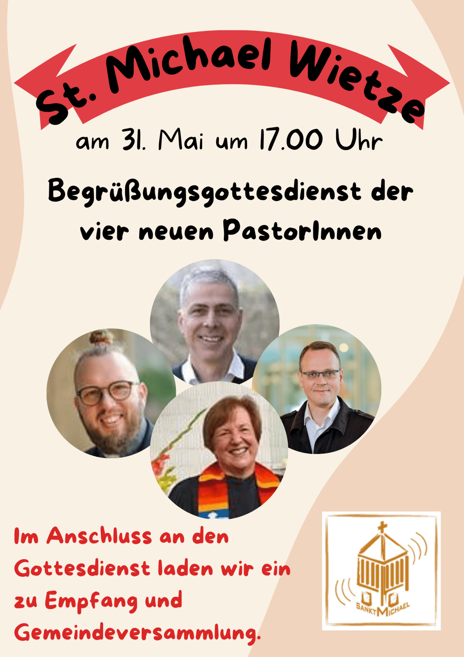 zur Gemeindeversammlung im Anschluss an den Gottesdienst am 31. Mai (circa 18 Uhr). Der für 10.15 Uhr geplante Gottesdienst wurde auf 17 Uhr verlegt, so dass alle vier Pastoren, die für unsere Wietzer Gemeinde tätig sind, teilnehmen können. Im Anschluss stellen sich Pastorin Susanne Bachmann-Günther aus Oldau und der kürzlich in Winsen ordinierte Pastor Sascha Weinkauf gemeinsam mit Pastor Mirco Kühne und Pastor Christoph Ricker dem Gespräch und der Gemeinde vor.